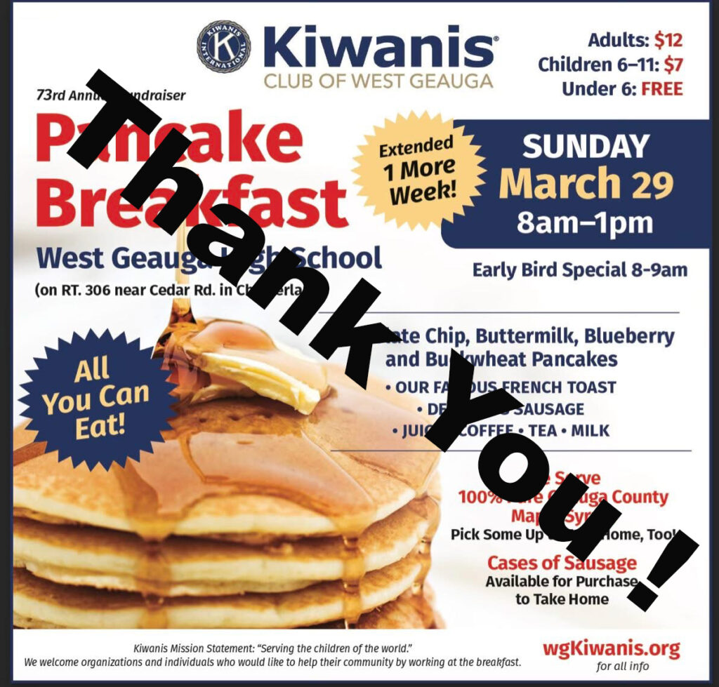 Dont Miss Out . Only two more weeks to enjoy delicious Pancakes, Sausage and French Toast. Join in on this community event where Scout troops, Band members, Kiwanis Key club and of course our West Geuaga Kiwanis members… Read More